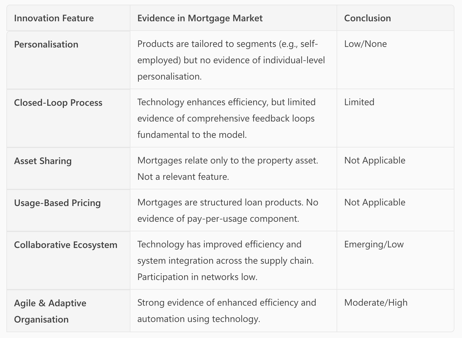 Based on this assessment, the mortgage market demonstrates meaningful alignment with only two of the six key innovative features (collaborative ecosystem and agile/adaptive organisation), confirming that business model innovation is not a prevailing force. This suggests the market is structurally resistant to the kind of fundamental change observed in other FinTech sectors.