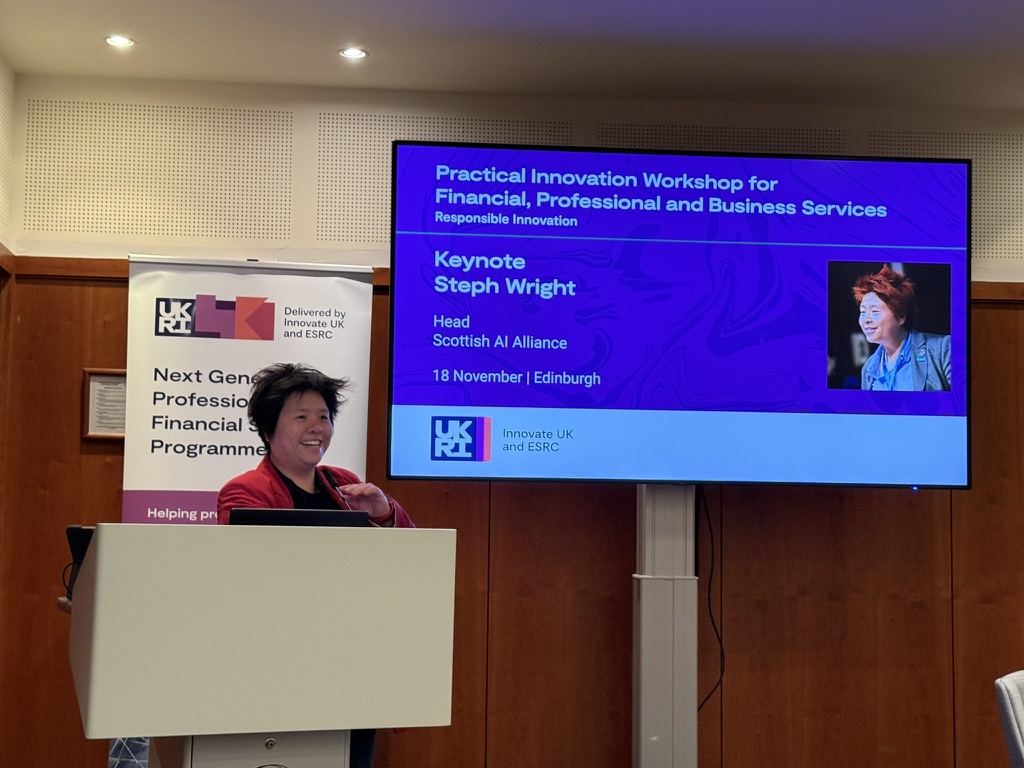 The keynote was delivered by Steph Wright from the Scottish AI Alliance, who emphasised Scotland’s ambition to become a global leader in trustworthy and inclusive AI. She encouraged participants to move beyond the question of how society should adapt to AI, and instead consider what kind of AI we want to build – and how it should adapt to us. Steph argued that responsible innovation begins not with building ethically, but with determining whether we should build something at all; not all innovation represents progress, and sometimes the most responsible choice is to hold back. She warned that responsibility without ethics risks becoming a mere compliance exercise, and emphasised the need for organisations to make conscious choices about where they draw their ethical boundaries. AI, she noted, is not an inevitable force but the result of human decisions, and its deployment must be matched with genuine understanding rather than rapid, uncritical adoption. Steph closed by highlighting practical support available to organisations, including Scotland’s free AI learning resources and the Scottish AI Playbook.